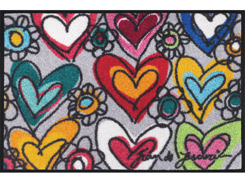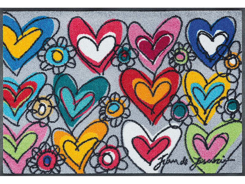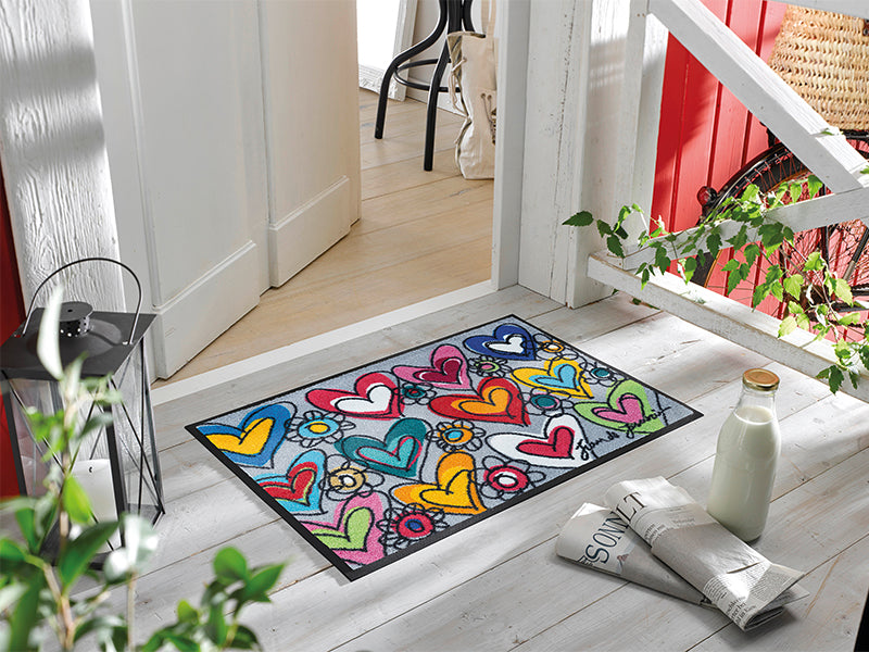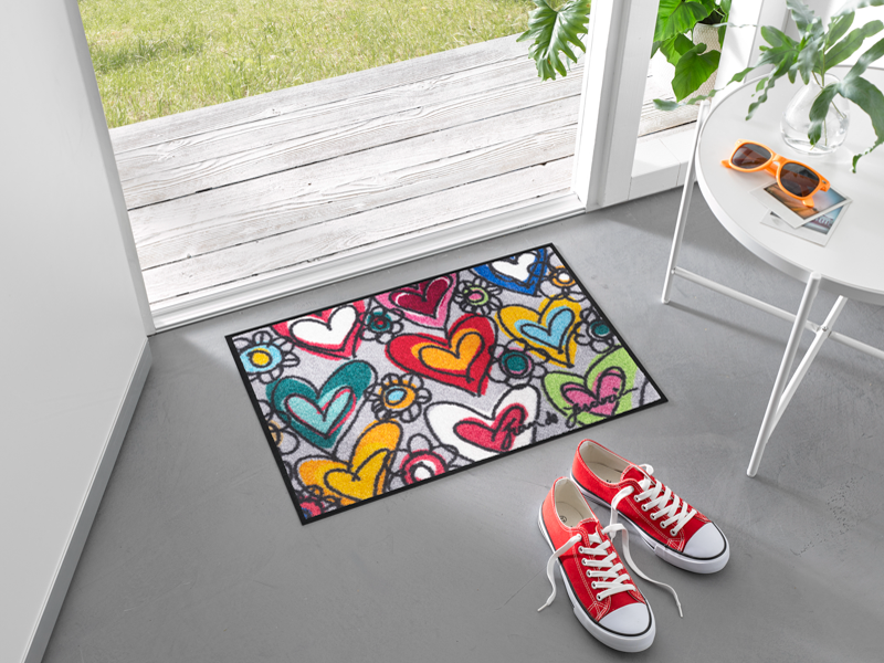 שטיח כניסה מעוצב לבבות שמכניס הביתה תחושת אהבה, תקווה ואנרגיה חיובית. מושלם למי שאוהב עיצוב עם משמעות ונגיעה אישית.