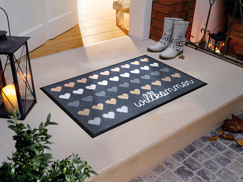 שטיח כניסה רומנטי ומזמין בעיצוב לבבות עדין עם הכיתוב “Willkommen” – ברוכים הבאים. מוסיף לחלל תחושת אהבה, חמימות ואירוח ביתי מושלם.
